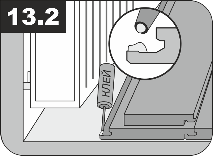8.1 Выбирайте клеевой способ монтажа в случаях, когда располагаете на кварцевом ламинате недвижимые элементы мебельных конструкций кухонь и кухонных островов, встроенной мебели (требующих крепления к полу) и т.п. Клеевой метод применяется на всю площадь или до ближайшего деформационного зазора.